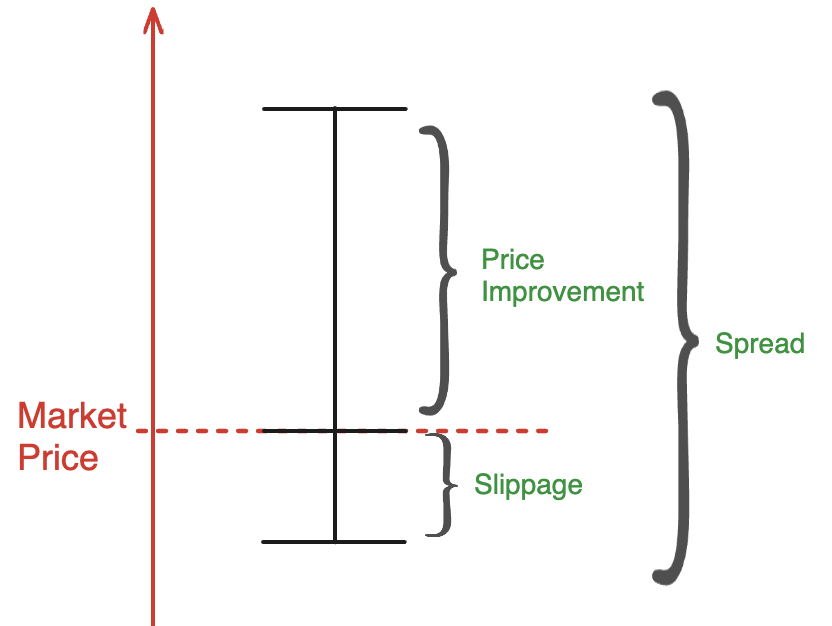 Quotes in UniswapX work differently than they do in the Uniswap AMMs. While AMM quotes return the market price with some buffer for slippage, UniswapX works to get users price improvement over the market price. The difference between the best and worst price in a UniswapX order is called its spread. When you set a Slippage Tolerance in your quote request, you’re only setting the amount below the market price you are willing to accept. UniswapX will still return a spread larger than your slippage tolerance when it’s able to find a price above the market price.